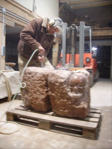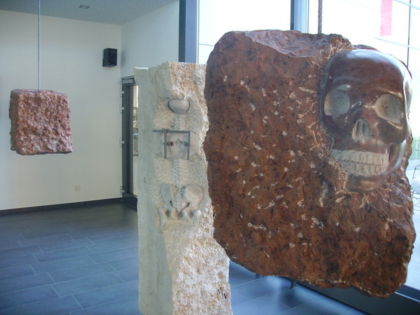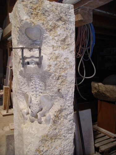 Auf der rückwärtigen Seite der Wasserfläche steht mittig und zentral ein massiver Jura Kalksteinblock mit einer Höhe von ca. 2 Metern. In die rechte Hälfte des Blocks ist ein menschliches Skelett mit der rückwärtigen Ansicht eingearbeitet. In einem Bereich der Wirbelsäule wird die darüber gespannte Haut von einem originalen Wirbelsäulenspreizer aus Titan auseinander gedrückt.