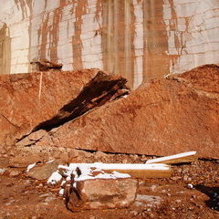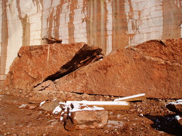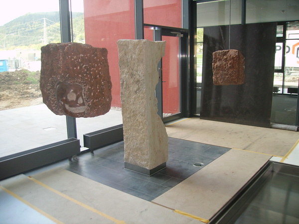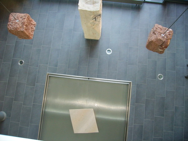Rechts und links von dem Jurablock hängen in Kopfhöhe zwei spaltrauhe Quader aus rotem Knollenkalk von der ca. 8 Meter hohen Decke. An jeweils eine Edelstahltrosse hängen diese Blöcke mit einem Gewicht von jeweils ca. 0,25 Tonnen.