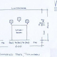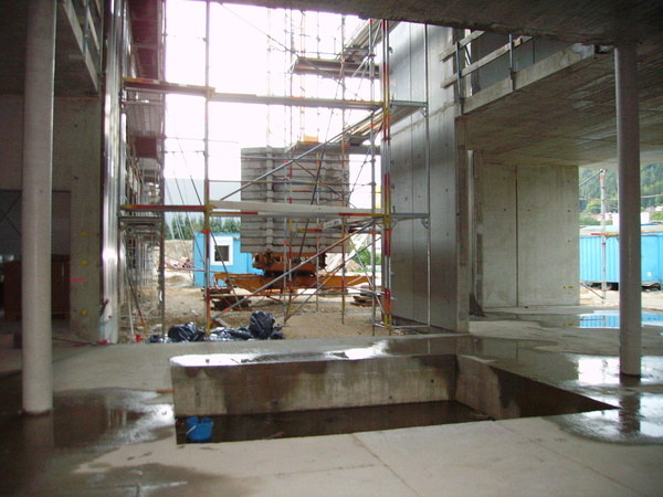 In der Mitte des Foyers ist ein 3 x 3 m großes Wasserbecken in dem Boden integriert.