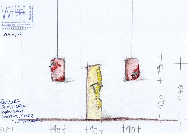 Die Gestaltung sieht ein dreiteiliges thematisch inspiriertes Skulpturenensemble vor sowie eine freie dem Ensemle vis-à-vis plazierte Steinplastik.