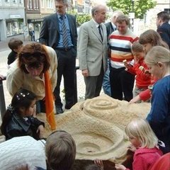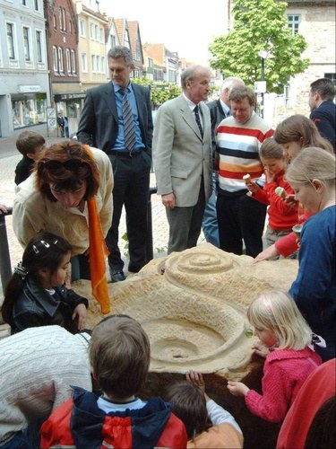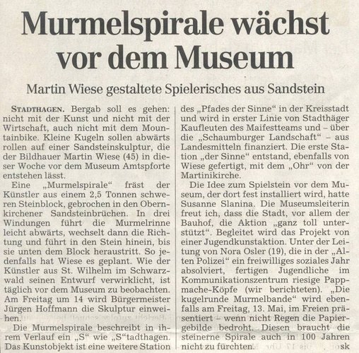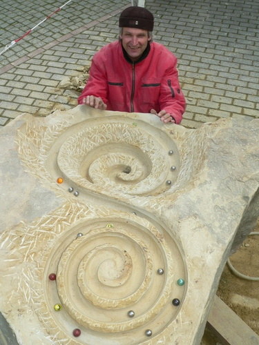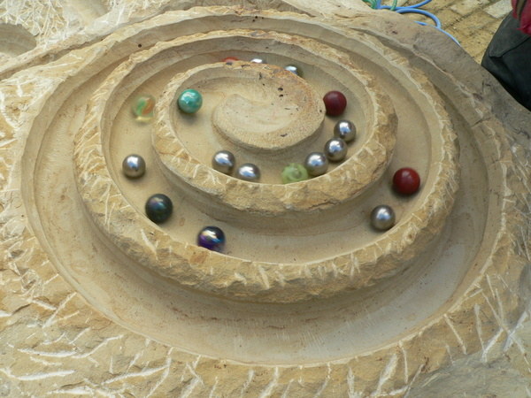 Im Rahmen der Konzeption "Pfad der Sinne" in Stadthagen habe ich für den Standort vor dem Museum "Alte Amtspforte" aus einem 2,5 t schwerem Sandsteinblock eine Murmelbahn in der Form eines "S" wie Stadthagen gestaltet.In einer Reminiszens an das bereits vor 500 Jahren verbreitete Spiel mit Murmeln entstand die Idee für die Renaissance Stadt Stadthagen.