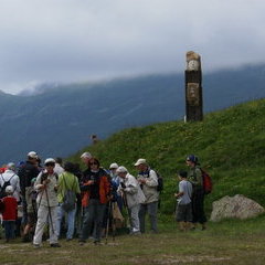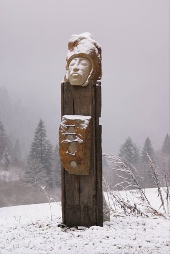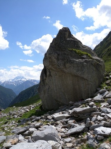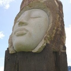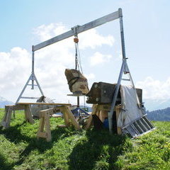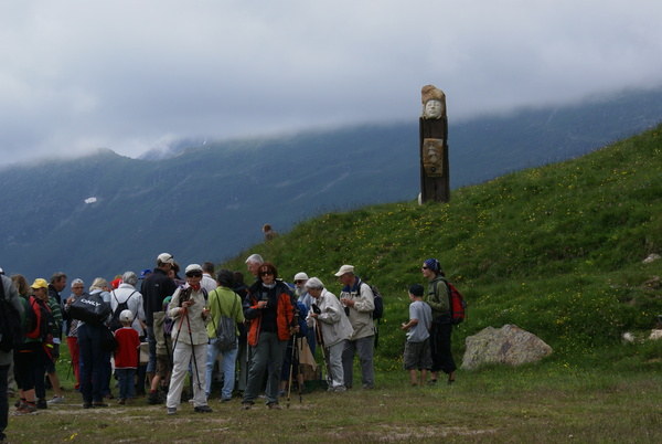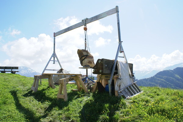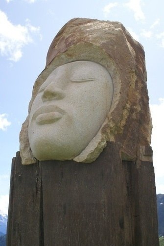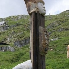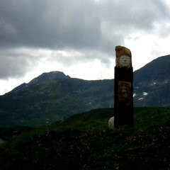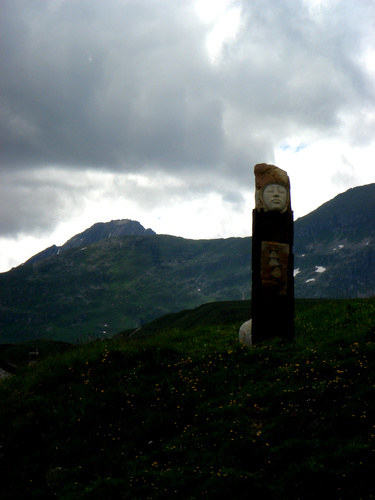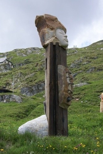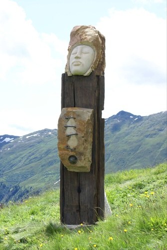Für mich stellvertretend ein Sinnbild der Schöpfungsgeschichte. Der auf dem unteren Balken, dem Korpus, angepaßte Steinkopf, schaut auf den Aletschgletscher, einerseits genießerisch, ob der herrlichen grandiosen Landschaft, zum anderen aber auch ignorierend was die Wahrnehmung von Landschaft- und Klimaveränderung angehen.