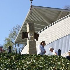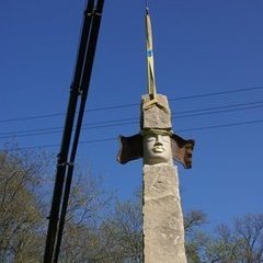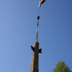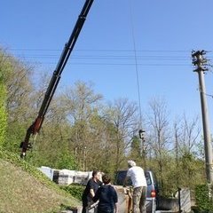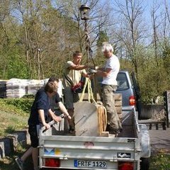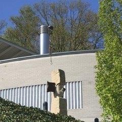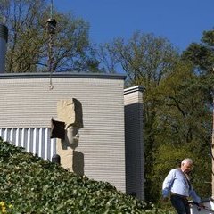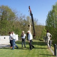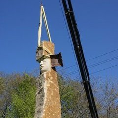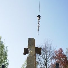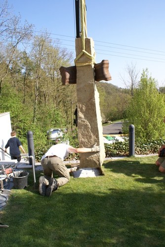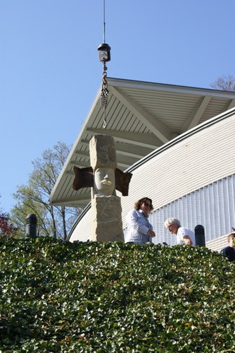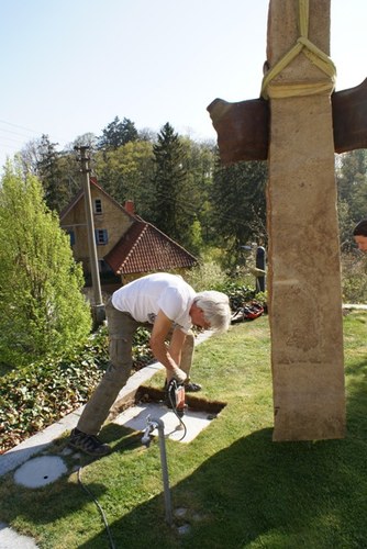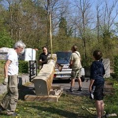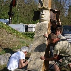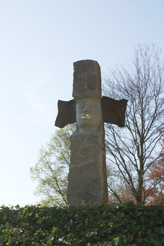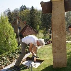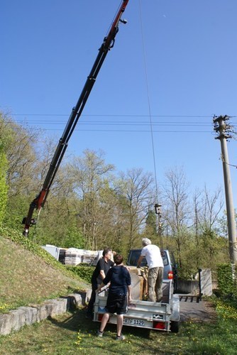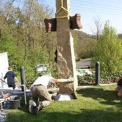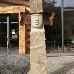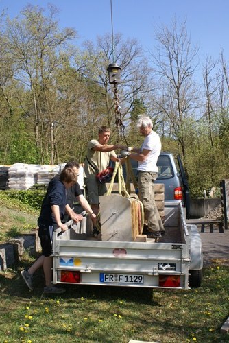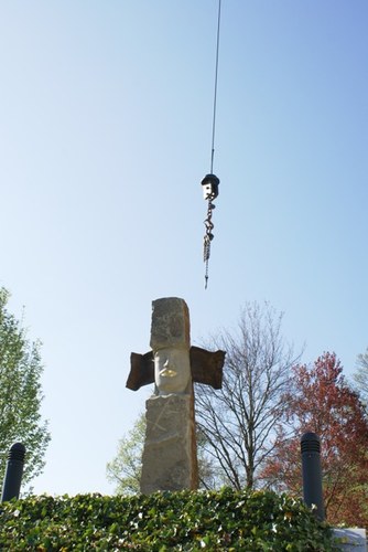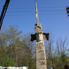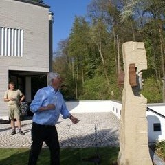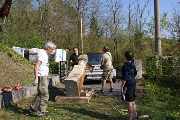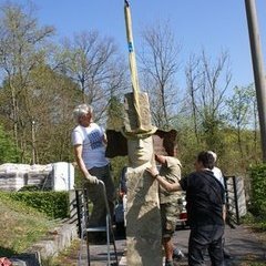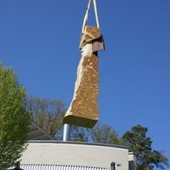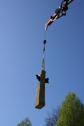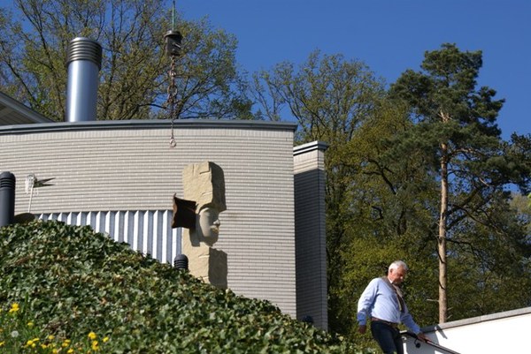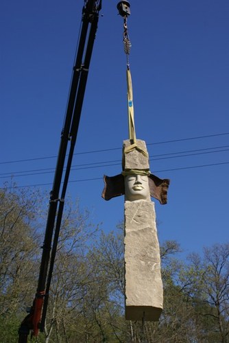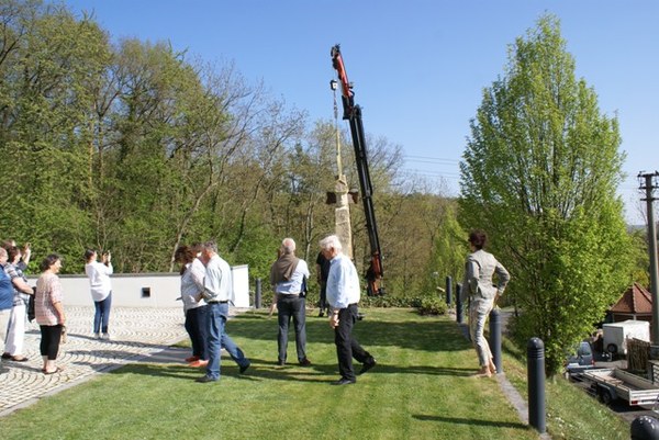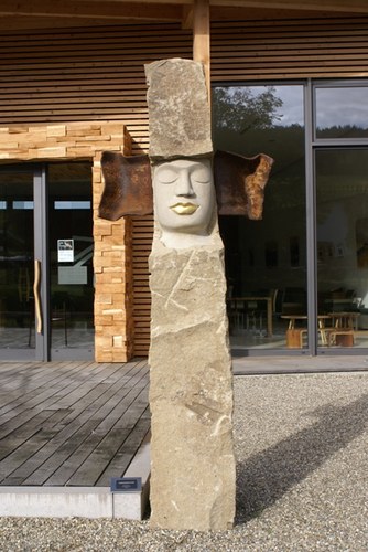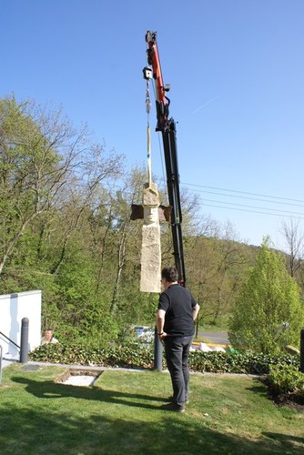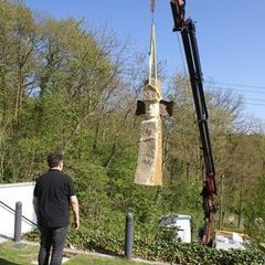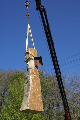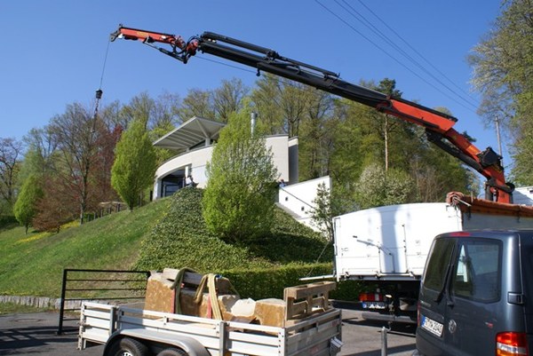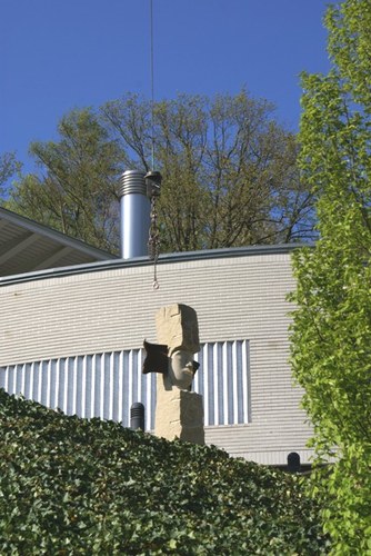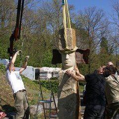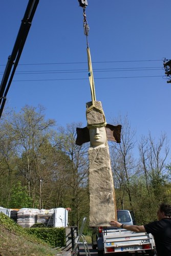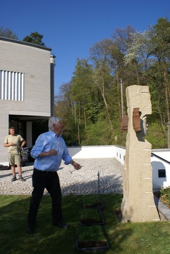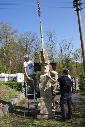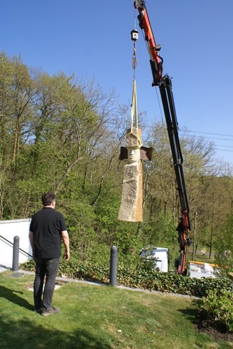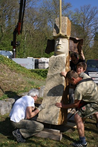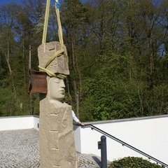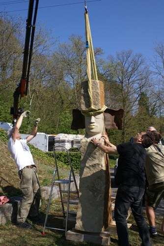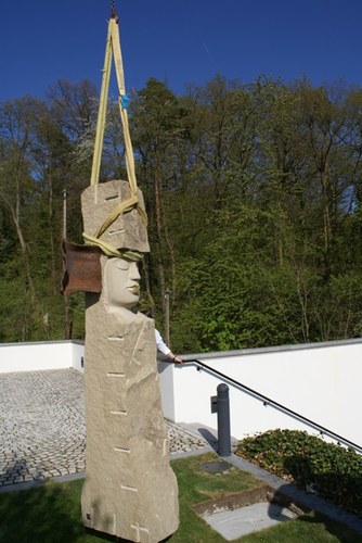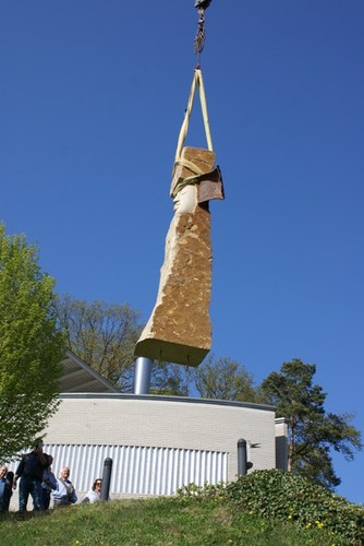 Mit einem großen LKW-Kran wurde der Erdenwächter dann auf die Anhöhe, auf der das sakral anmutende Gebäude erbaut ist, empor gehoben und in Position gebracht. Als Wächter schaut die Skulptur nun vom Haus abgekehrt in die tieferliegende Ebene.