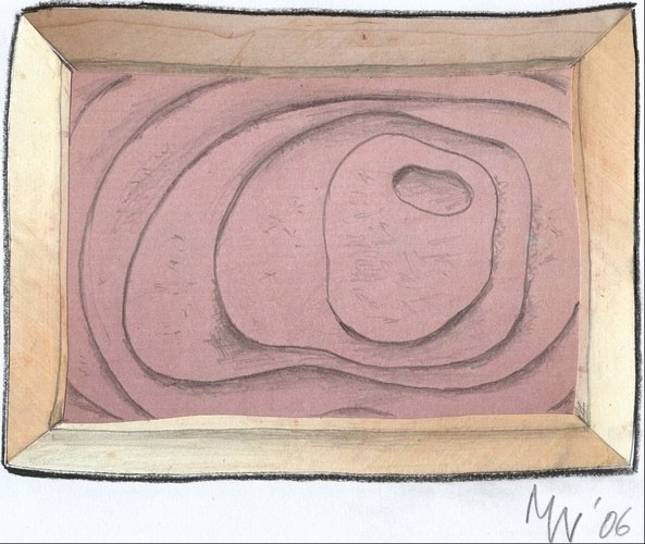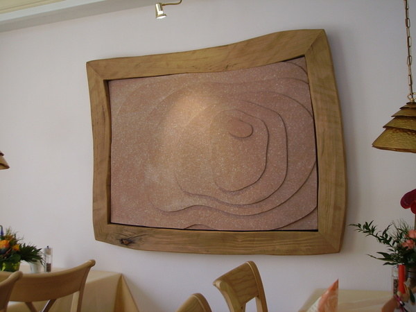 Dem Wunsch, roten Sandstein in den Raum zu bringen, wurde ich mit der Idee eines "Sandsteinbildes" gerecht. Eine massive Sandsteinplatte, in der die die Topographie, die Höhenlinien einer Berglandschaft, reliefartig eingearbeitet sind. Das Bild ist eingefasst in einem schweren Rahmen aus grob gearbeiteten Eichenbalken - dieser korrespondiert wiederum mit der im gegenüberliegenden Raumteil stehenden Lichtsäule.