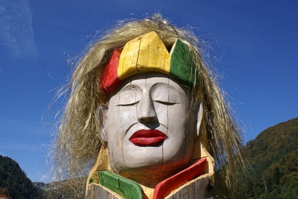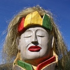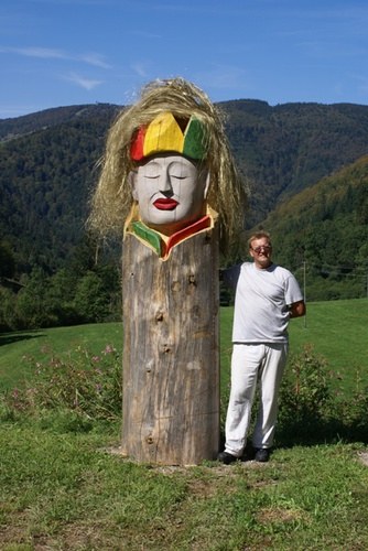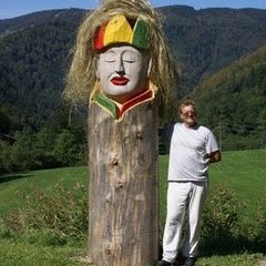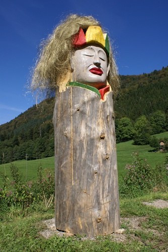 Aus einer Weißtanne gehauen, Durchmesser 90 cm und 280 cm hoch, farbig gefaßt, mit Haaren aus Messing Erodierdraht.