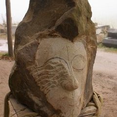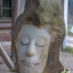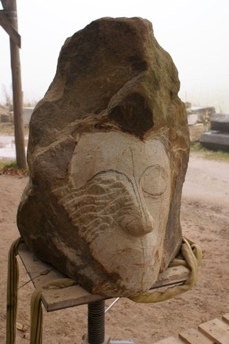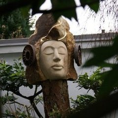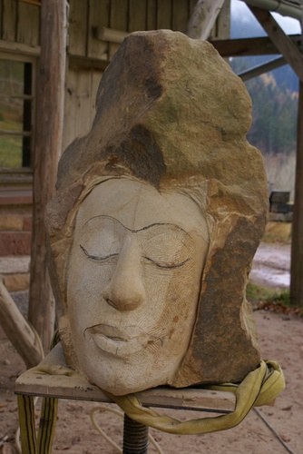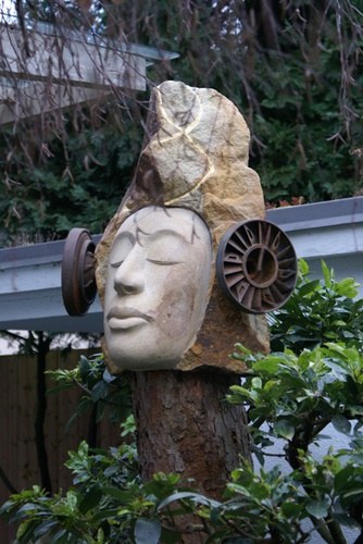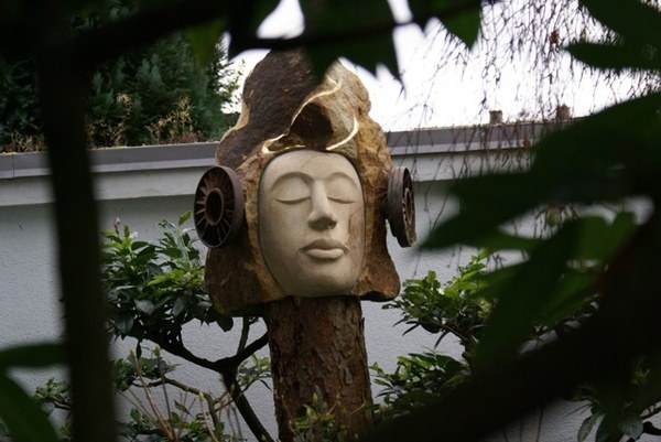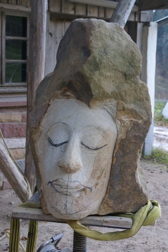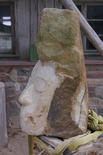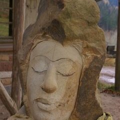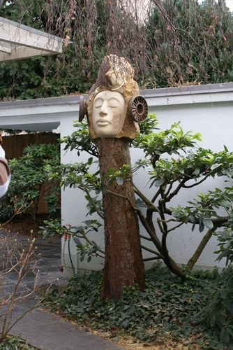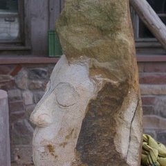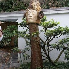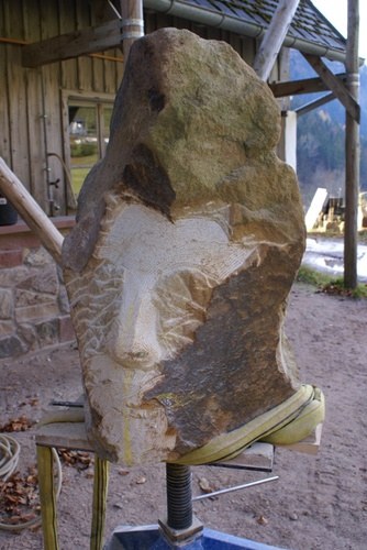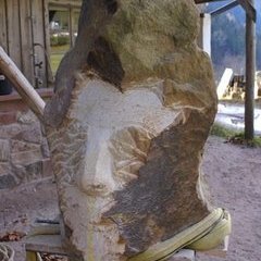 Hier entstand eine Skulptur aus einem vorhandenen ca. 2 m hohen Baumstamm und einer den vorgegebenen Proportionen entsprechenden Kopfplastik aus Quarzsandstein - unter Hinzunahme von Altmetallteilen und einer partiellen Vergoldung in Blattgold.Bitte klicken Sie das gewünschte Bild an, um es zu vergrößern....