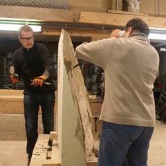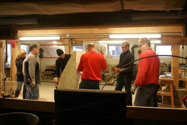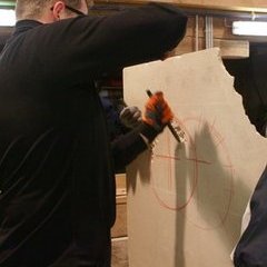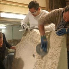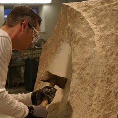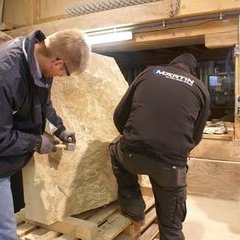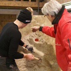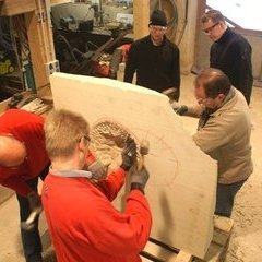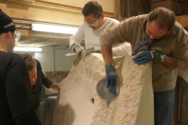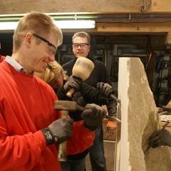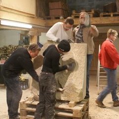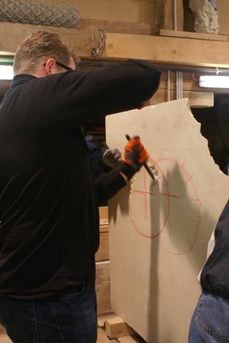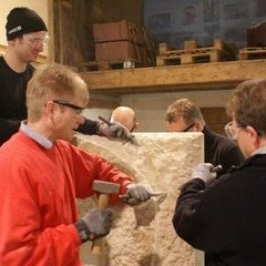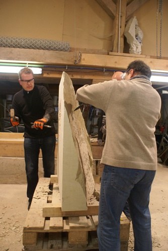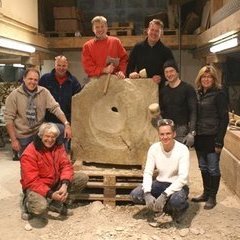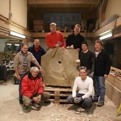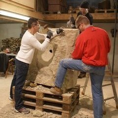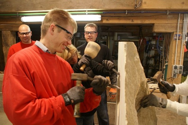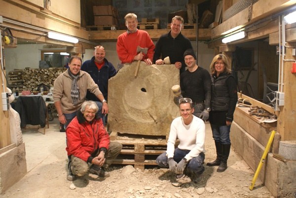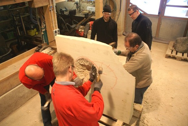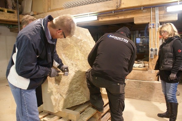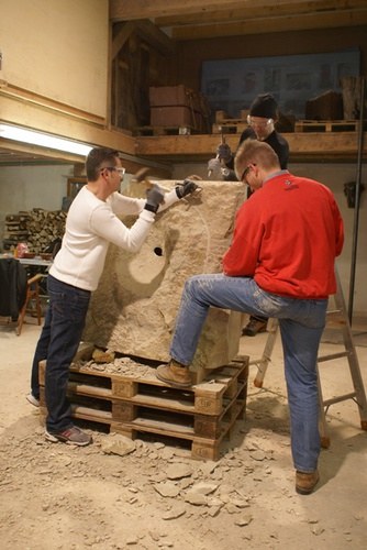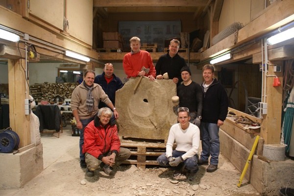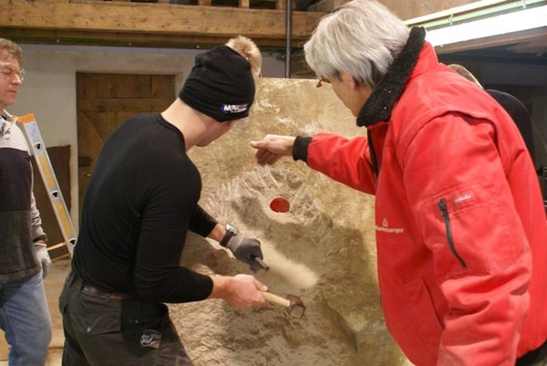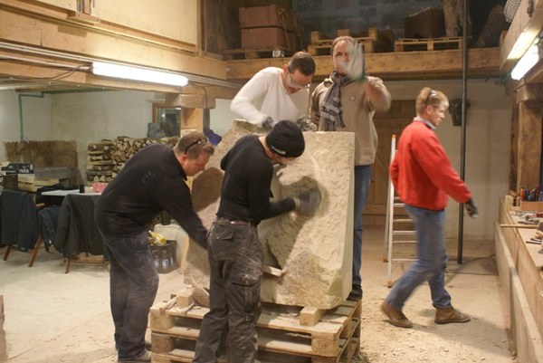 Nachdem die Gestaltung im Team besprochen und geplant war - eine dynamische Spirale, die sich um den zu erarbeitenden Durchbruch zu einer Seite aus dem Stein herausdreht, wurde im 8er Team der Stein von zwei Seiten zeitgleich bearbeitet.