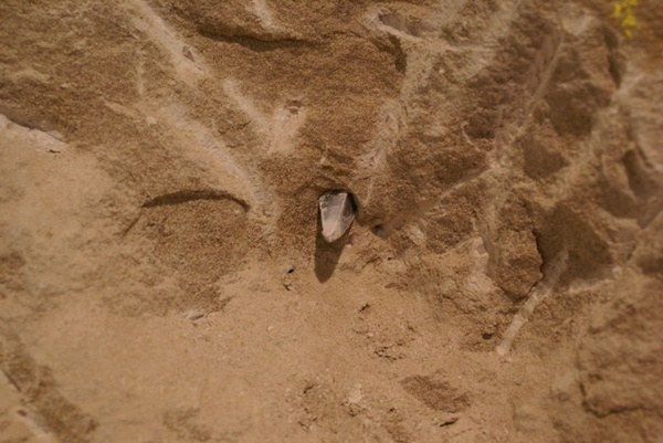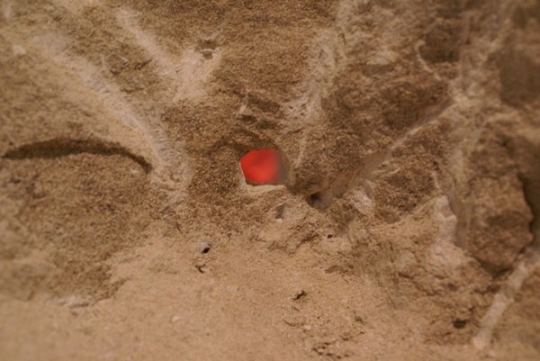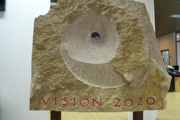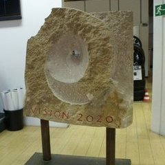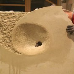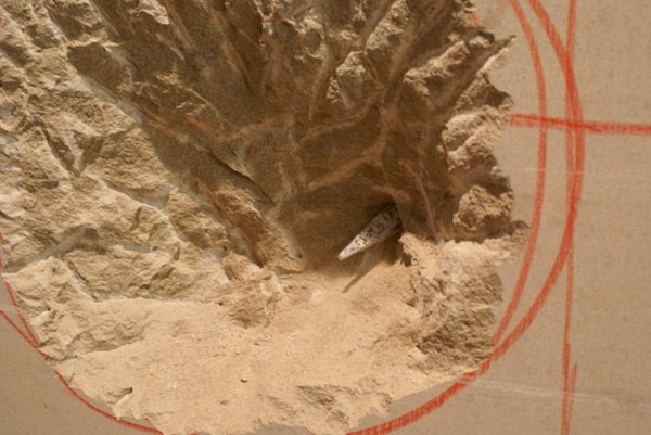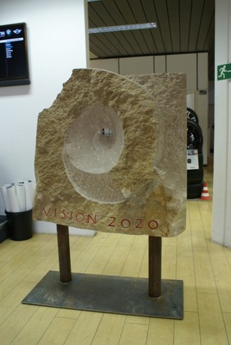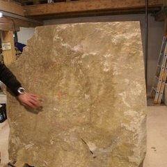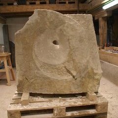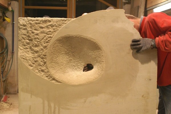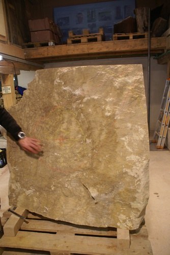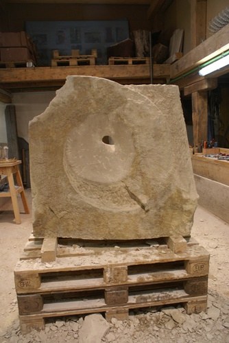 Um dieses kompakte und umfangreiche Thema auf die Beine zu stellen, bedurfte es eines Durchbruchs. Dieser sollte nun im Atelier in praktisch und nachvollziehbarer Art und Weise erreicht werden. Martin Wiese hatte einen großen Thüster Kalkstein besorgt, der sich aufgrund seiner partiellen geringen Dicke anbot, im Rahmen einer Gesamtgestaltung zu durchschlagen.